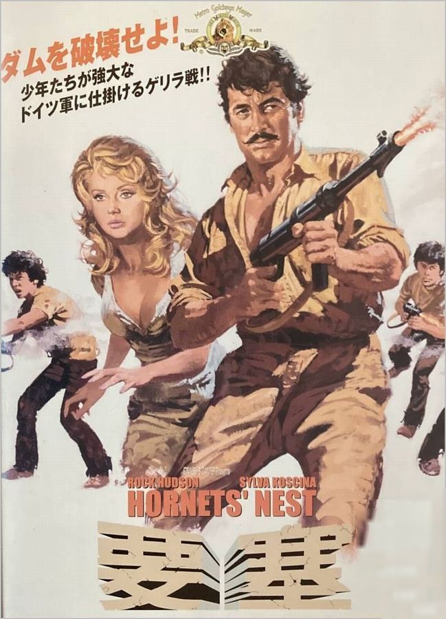 6578 | イタリアの村レアノートの住民はパルチザンの居所をしゃべらなかったために、ナチ親衛隊に皆殺しにされた。復讐を誓った少年たち(アルドをリーダーとする17人)と米兵の破壊工作員(ターナー)、ドイツの野戦病院の女医(ビアンカ)。村にある司令部を襲撃し、ダムを破壊するための作戦を、ターナーと少年たちは展開する。ダム破壊は成功はしたが・・・製作:スタンリー・S・カンター、原題:Hornets' Nest、監督:フィル・カールソン、音楽:エンニオ・モリコーネ、出演:ロック・ハドソン(ターナー)、シルヴァ・コシナ(ビアンカ)、ジャック・セルナス(タウシグ少佐)、マーク・コレアノ(アルド)。109分。 |